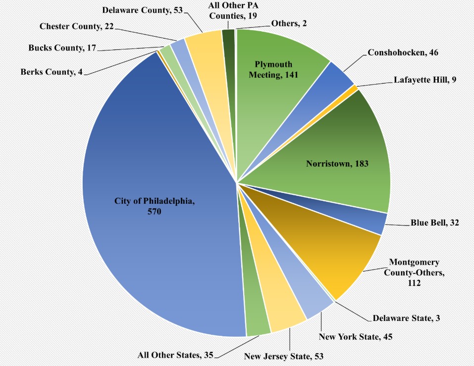 In 2025, the department made 1,346 arrests. Of those, 570 or 42% were residents of Philadelphia. Less than 6% were residents of Plymouth Township. Please note that the data uses zip codes, thus to determine “less than 6%” we calculated Conshohocken and Plymouth Meeting’s totals.