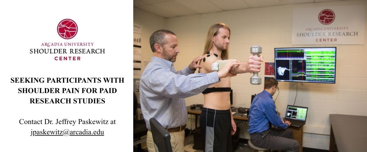 The Arcadia University Shoulder Research Center is recruiting participants with shoulder pain and between the ages of 18-65 for a series of paid research studies ($50-$125 for 1.5-4 hours, split between 1-3 sessions) to assess brain activity in response to either neuromuscular electrical stimulation or pain-relieving injections.