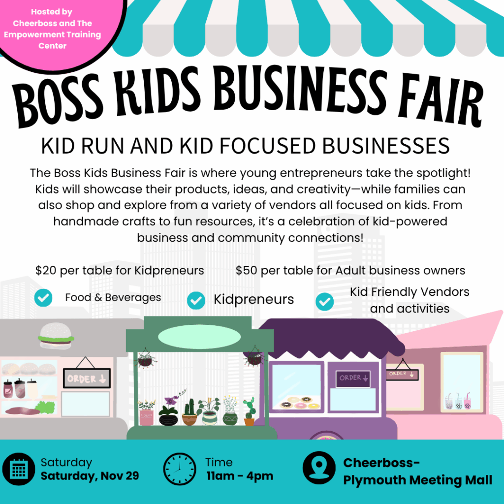 Get ready for a fun-filled day of creativity, innovation, and community spirit at the Boss Kids Business Fair, hosted by Cheerboss and The Empowerment Training Center! This exciting event will take place on Saturday, November 29, from 11 a.m. to 4 p.m. at the Cheerboss–Plymouth Meeting Mall.