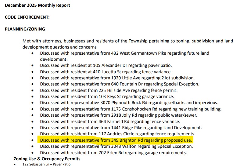 A sober home, or anything involving the Brighton Road address, has appeared as an agenda item for a township meeting as of January 2026. The address was mentioned in a monthly report (December 2026) submitted by the township’s zoning officer on January 7th. In that report, the zoning officer states that a meeting was held with a representative of the property regarding a proposed use.