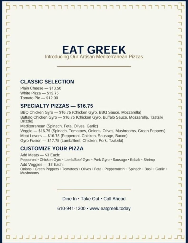 Eat Greek on East 1st Avenue in Conshohocken recently announced that it has added pizza to the menu. The pizza is described as “Artisan Mediterranean” made with Greek inspired dough. It is available for dine-in or takeout. Orders can be placed online.