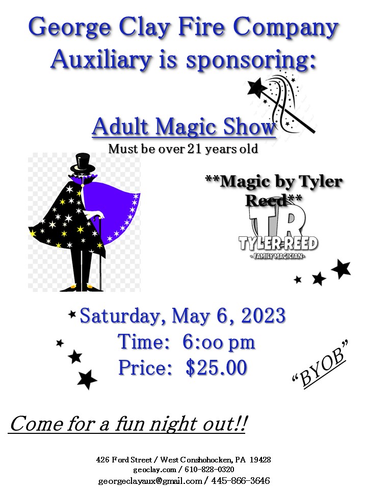 Stop by for a wonderful night out without the kids! An adult only magic show at the George Clay Fire Company on May 6 at 6 pm. This "BYOB" event will be a fun time for a girls night out, date night, or just to spend a few hours away from the house!! No one under 21 years of age admitted. Cash only at the door. Magic by Tyler Reed!