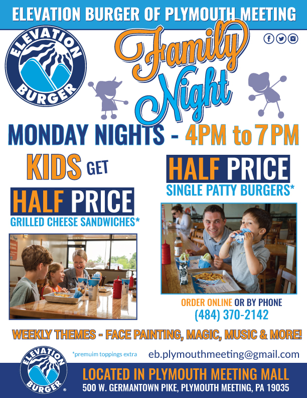 Beginning Monday, April 4th, Elevation Burger at the Plymouth Meeting Mall with be introducing Monday Family Nights. From 4:00 p.m. until 7:00 p.m., kids gets ½ price single patty burgers or a grilled cheese sandwich (premium toppings extra). The entire family will enjoy local entertainment to include live music, magicians, balloon artists and more.