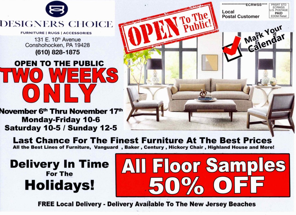 Designer’s Choice (131 East 10th Avenue) in Conshohocken has extended its sale through November 17th. This sale represents the first opportunity in two years for the public to purchase all floor samples at 50% off! Designer’s Choice is the company that sprang from Light-Parker Furniture, which was located at the corner of West 1st Avenue and Fayette Street for over 50 years.