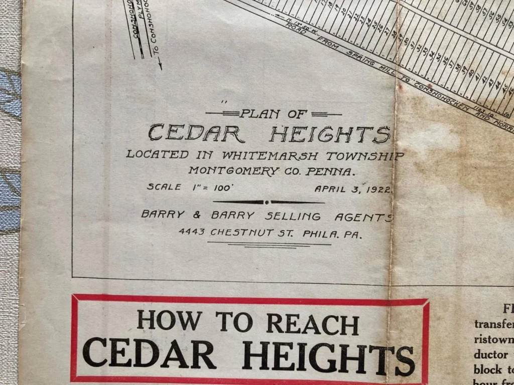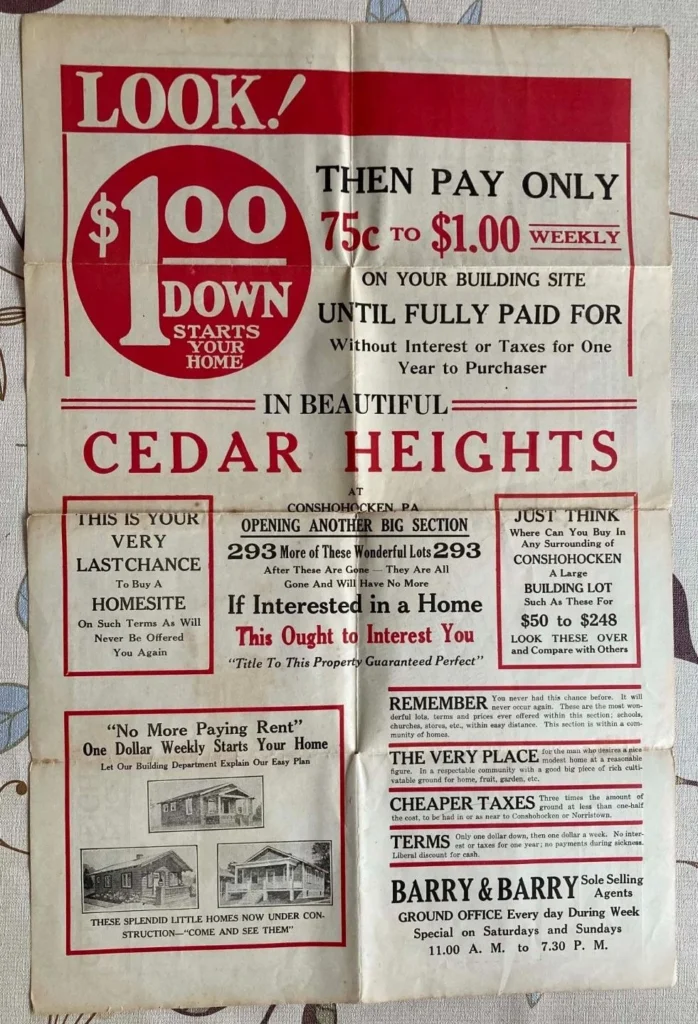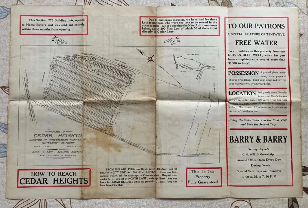 Back in 1922, the Cedar Heights section of Conshohocken (Whitemarsh Township) was being developed into a dense neighborhood with several hundred new home lots available. The advertisement for the latest round of lots being offered points out that the first 275 were all sold in just three months. The new area being opened up for development has 293 lots.