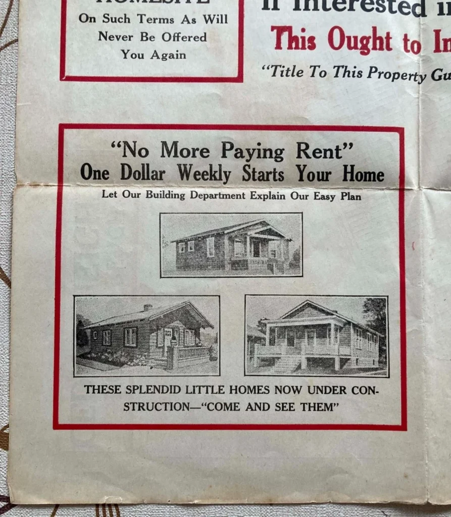 The lots were priced at just $1 down with 75 cents to $1 a week there after (each lot cost between $50 to $248). The advertisement does not state the expected price of building a house on the lots. There was a builder involved, but you could also have brought in an outside builder (based on how it describes access to a well that was built in the neighborhood).