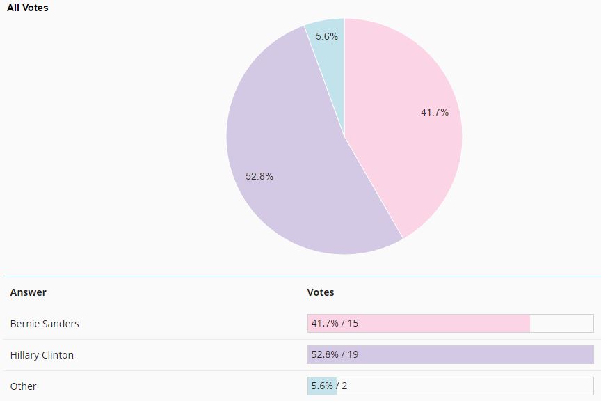 Last night we asked readers to vote for their preferred candidate in their party’s Presidential primary. John Kasich won for the Republicans and Hillary Clinton won for the Democrats. Not that many people voted, but below are the results: