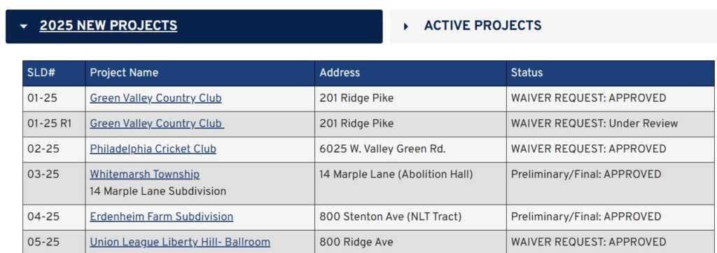 Whitemarsh has the closest system to that of Whitpain. One thing it does that isn’t done by Whitpain is that it also tracks the projects post approval. See sample of Whitemarsh’s page above.