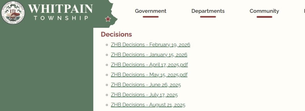 Here is how we will score the local municipalities on this issue. The first five points reflect how it compares to the gold standard of Whitpain. An additional four points represent the availability of the applications and supporting documents with agendas through the approval process. A tenth point is available if they post the outcome of a zoning hearings (see image from Whitpain’s website directly above).